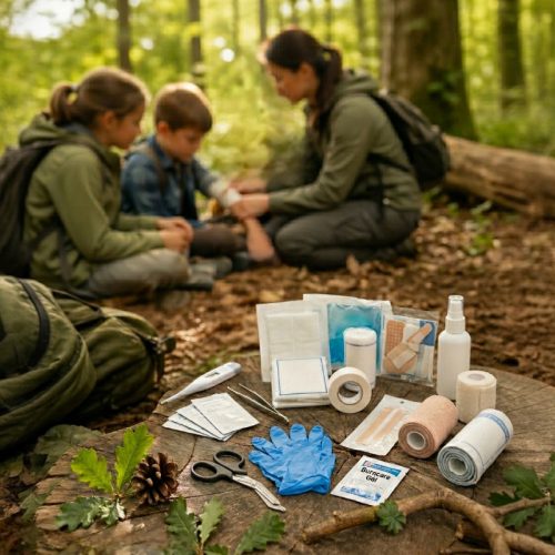 Komplett, tanárok számára is biztonságosan használható elsősegély csomag erdei iskolákhoz és kirándulásokhoz. A készlet a leggyakoribb sérülések – horzsolások, vágások, kisebb vérzések, égések és rándulások – gyors és hatékony ellátására lett összeállítva, kizárólag nem invazív eszközökkel.