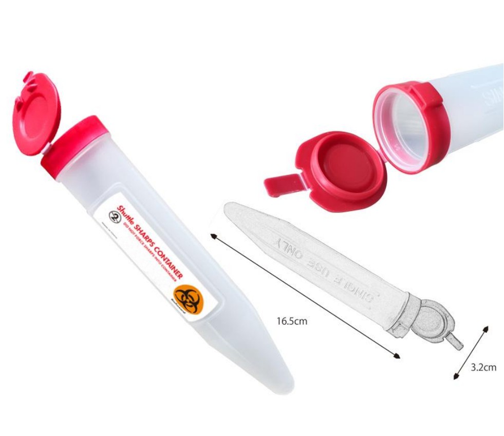 A hordozható tűeldobó tartály vastag falú, tartós műanyagből készült fiola formájú, melynek kupakja stabil záródást biztosít, meggátolva ezáltal a fertőző anyagok kijutását, valamint a használt injekciós tűk és más éles vagy hegyes, esetleg biológiailag veszélyes eszközök szétszóródását.